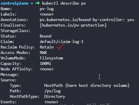 - hostPath 타입은 해당 노드에 연결된 path이다. kode kloud는 control plane노드 하나니까 시험시에는 이걸 확인하자