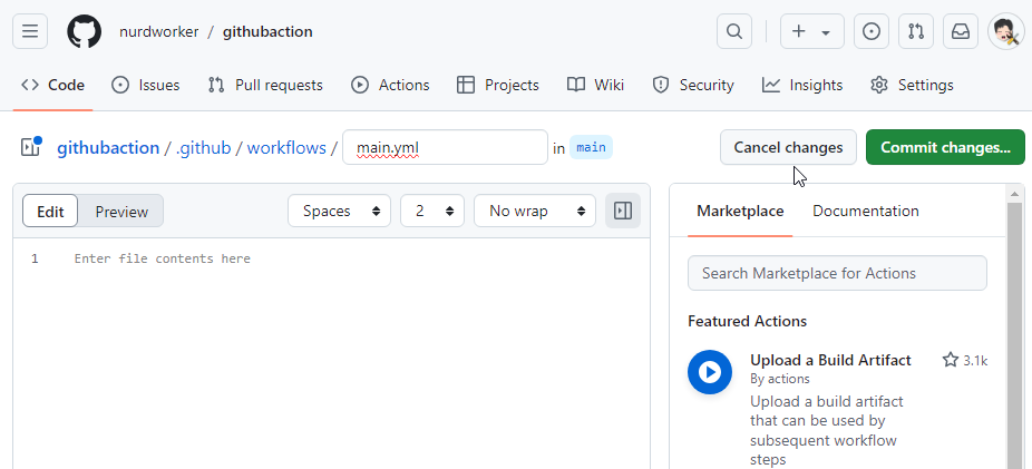 그럼 해당 repository에 /.github/workflow/main.yml파일이 하나 생긴다.