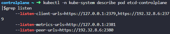 kubectl -n kube-system describe pod etcd-controlplane |$grep listen