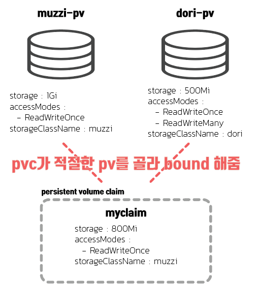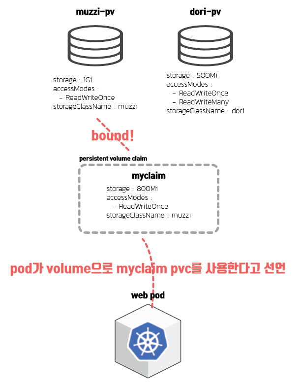 이제 pod에서 volume을 pvc를 사용한다고 하면 pod의 볼륨이 pvc가 bound된 pv를 사용하게 된다.