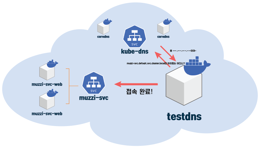 k8s클러스터에서는 이렇게 서비스에 연결된 pod형식으로 dns서버역할을 하는 coredns pod들이 있다.