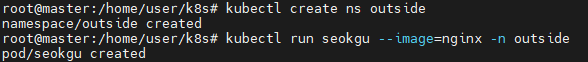 outside라는 네임스페이스를 만들고, 여기에 seokgu라는 pod를 만들어줬다.