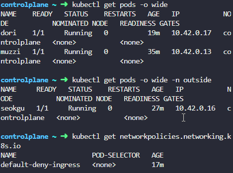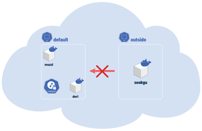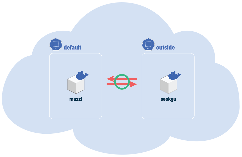 outside ns 의 seokgu에선 muzzi pod와 통신이 안되지만, 같은 default ns의 dori pod에서는 통신이 된다.