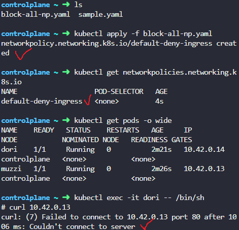 참고로 network policy는 모든 트래픽이 허용된다. default-deny-ingress에서 모든 통신을 차단하는 정책을 만들어주고