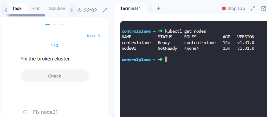 - kode kloud풀면서 1번만 맞았다.. 단순히 kubelet만 살려주는거.