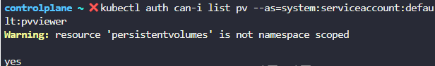 kubectl auth can-i list pv --as=system:serviceaccount:default:pvviewe