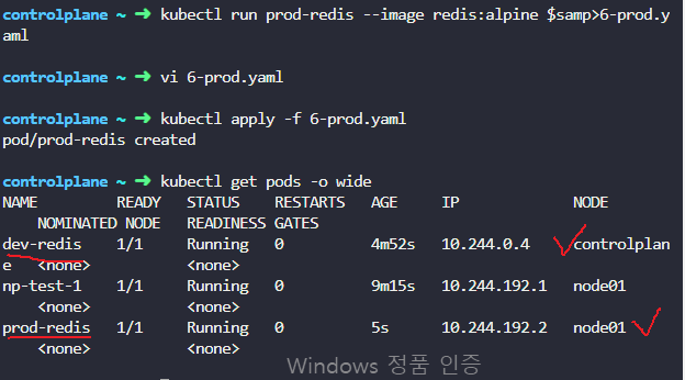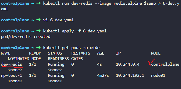 dev-redis pod는 node01에 스케줄링 안되야하니까 그냥만들면댐