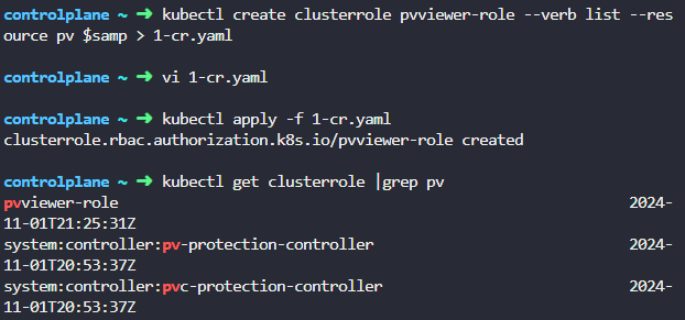 kubectl create clusterrole pvviewer-role --verb list --resource pv