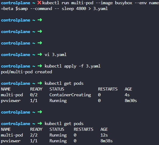 kubectl run multi-pod --image busybox --env name=beta $samp --command -- sleep 4800 > 3.yaml