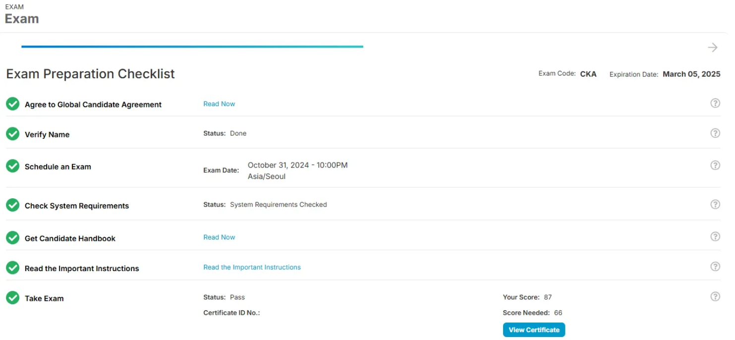 - 내 k8s포스팅한것들 어느정도 이해할 수 있는 상태면 그리 어려운 시험은 아니다. 모든 k8s포스팅 다 알아야한다는건 아님. 대충 이정도 k8s 지식을 가지고 준비했다는 점만 말하고 싶음.