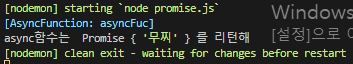 이렇게 무찌는 엉덩이라는 출력이나오고 1초후에 await붙은 async함수의 return값을 받아와서 코드를 실행시켜준다.