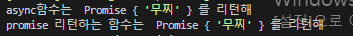 아까 위에서 그냥 함수 호출후 return값을 확인했을때는 promise객체가 튀어나왔지만, 또다른 async함수 내에서 await예약어를 붙여서 return값을 확인하니 '무찌'라는 따끈따끈한 스트링이 내뱉어졌다.