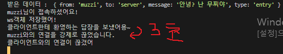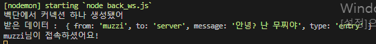 프론트 코드를 실행할때마다 백단 콘솔에서 받은데이터와 무찌님이 접속했다고 잘 찍어준다.