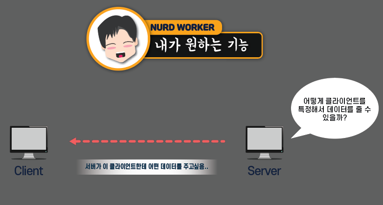 하지만 서버는? '요청을 받아야만' 해당 요청에대한 1:1 응답을 할 수 있는 구조다. 때문에 클라이언트를 특정해서 그 클라이언트한테만 데이터를 보낼수가 없다.