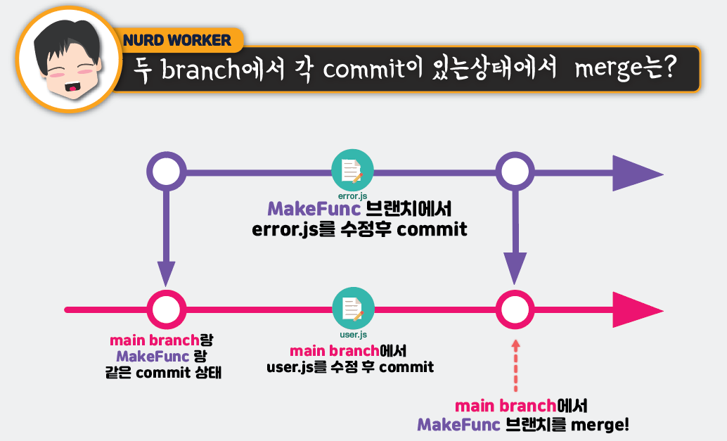 아까도 두 브랜치에서 각각 코드를 수정하고 commit을 한 상태에서 merge를 했는데 충돌이 안난 이유는 각브랜치가 user.js랑 error.js파일을 각각 건들였기 때문이다.