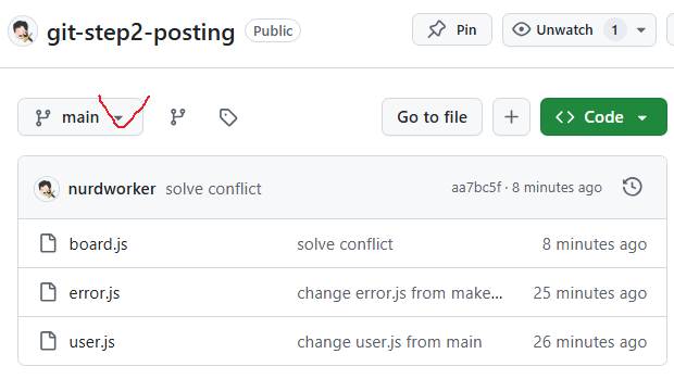 먼저 main브랜치에서 code freom main이라는 코드를 user.js에 추가해줬다.