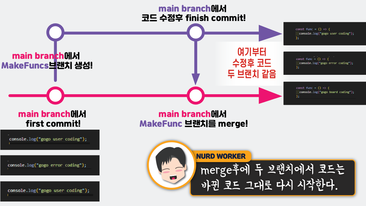 main브랜치에서 makeFuncs브랜치를 merge한 후, 이제부터 두 branch는 함수형으로 바뀐 저 코드 상태를 시작점으로 다시 시작한다. 즉 두 브랜치의 코드가 걍 일치하게 된다는거임.