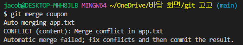 coupon브랜치에서 같은파일 app.txt를 같은줄을 수정했으면 충돌되버림.